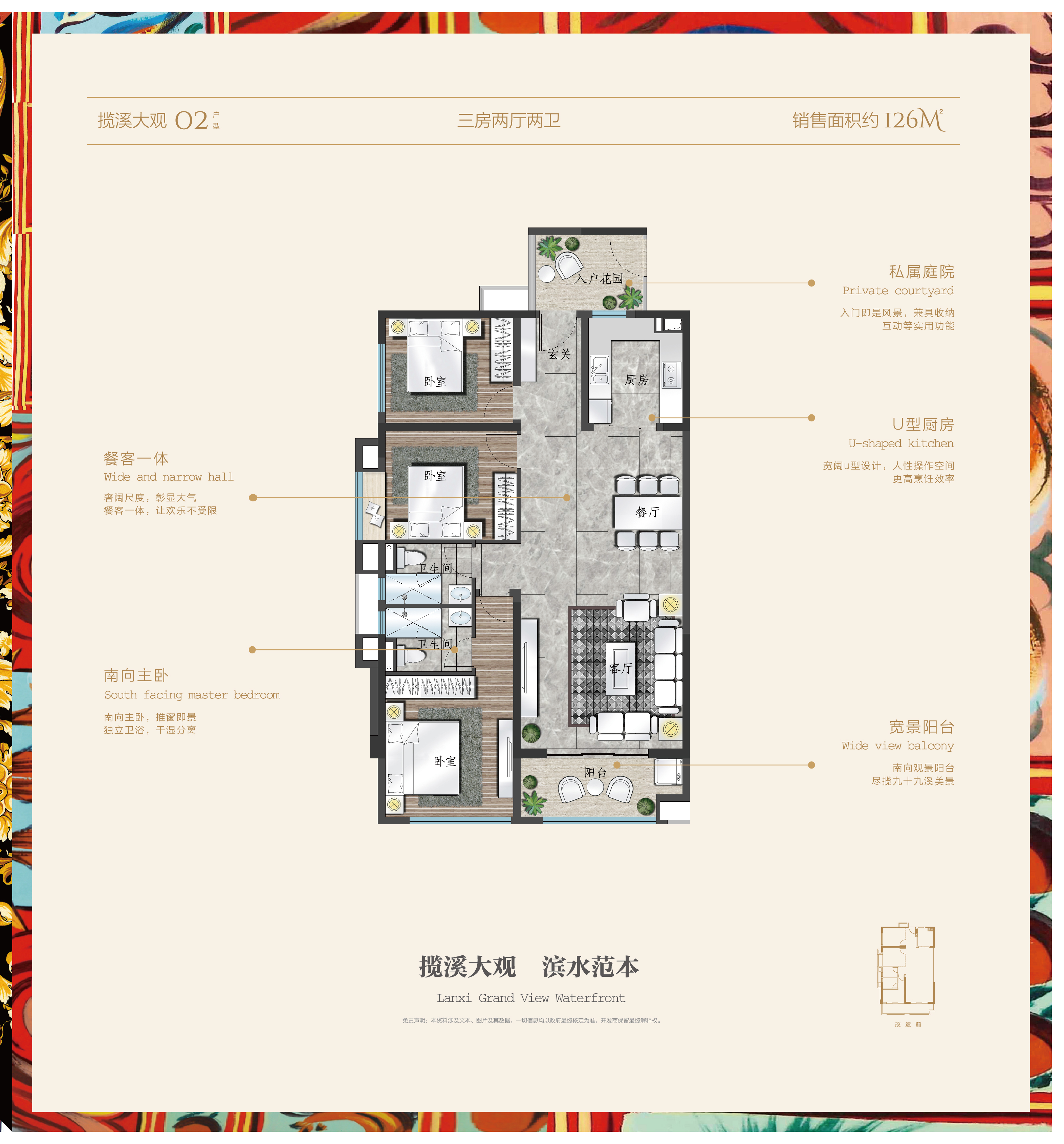 阔绰三,宽绰横厅,约38平餐客一体,5.1米超宽客厅,全能套卧,干湿分离,9.6米长轴阳台,超广角视野,U型厨房,空间利用最大化,私密玄关,呈现归家礼仪,全系套房,独立卫浴。