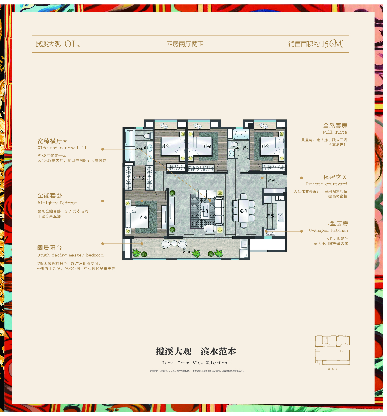 阔绰四房,宽绰横厅,约38平餐客一体,5.1米超宽客厅,全能套卧,干湿分离,9.6米长轴阳台,超广角视野,U型厨房,空间利用最大化,私密玄关,呈现归家礼仪,全系套房,独立卫浴。